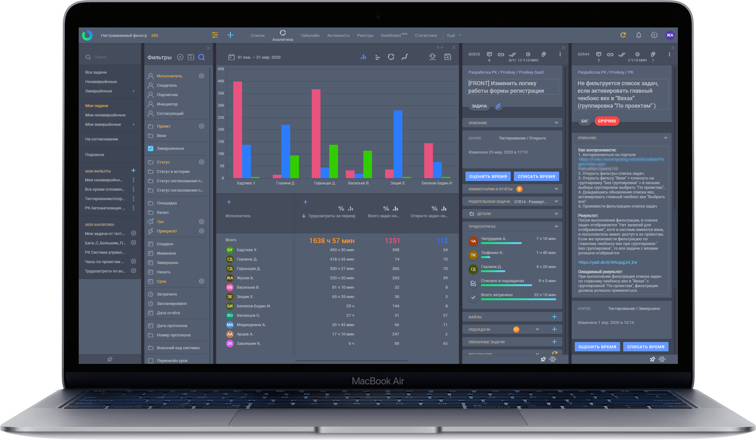 Возможность списывать по задачам трудозатраты, ограничения периода списания времени (по-простому – сколько времени функция списания времени будет активна для завершенной задачи), чтобы дисциплинировать сотрудников. Трудозатраты за любой период можно проанализировать в различных разрезах (по проектам, по сотрудникам и т.д.). Возможность оперативного контроля трудозатрат путем утверждения списаний.