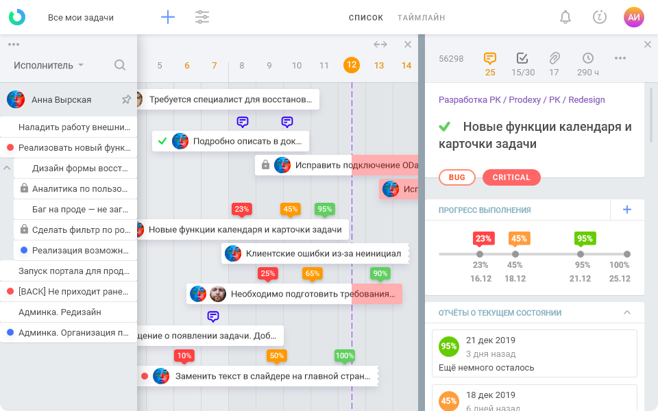 Наличие удобного инструмента планирования задач. Задания отображаются на календаре. Можно увидеть общую картину по срокам задач. Есть возможность отслеживать статус задач в контрольных точках, просматривать отчеты о выполнении, группировать по проекту, исполнителю, типу, статусу, приоритету.